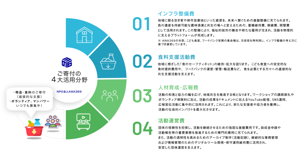 千葉県館山市の安房地域を拠点に、地域課題の解決と共生社会の実現を目指すNPO法人 AWA369。 「農林漁業」「福祉」「地域資源の循環」の三本柱を軸に、未利用魚の活用、フードバンク安房、子ども食堂「フードライズ369」を運営し、地域循環の未来を目標とします。